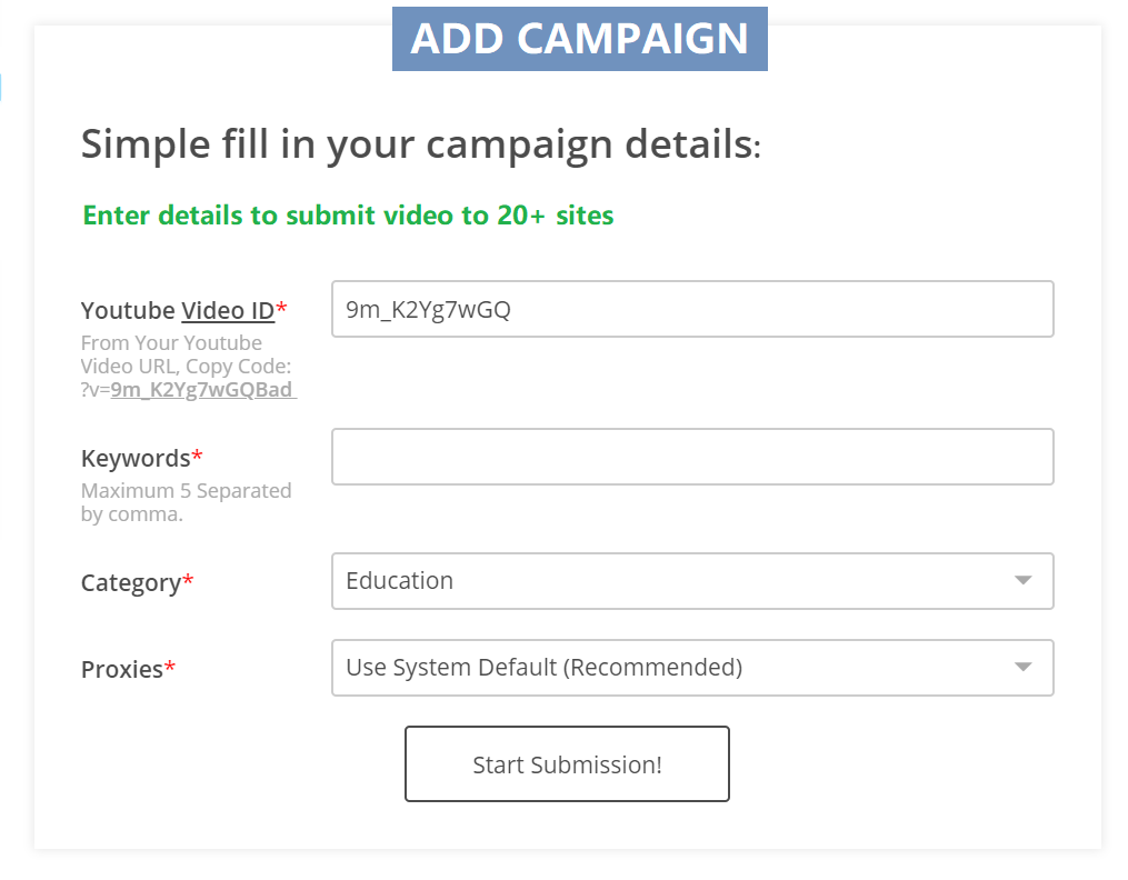 Enter your Youtube Video ID and leave the rest on VideoSubmitter as it will pull all the details from YT while submitting to 20+ sites.