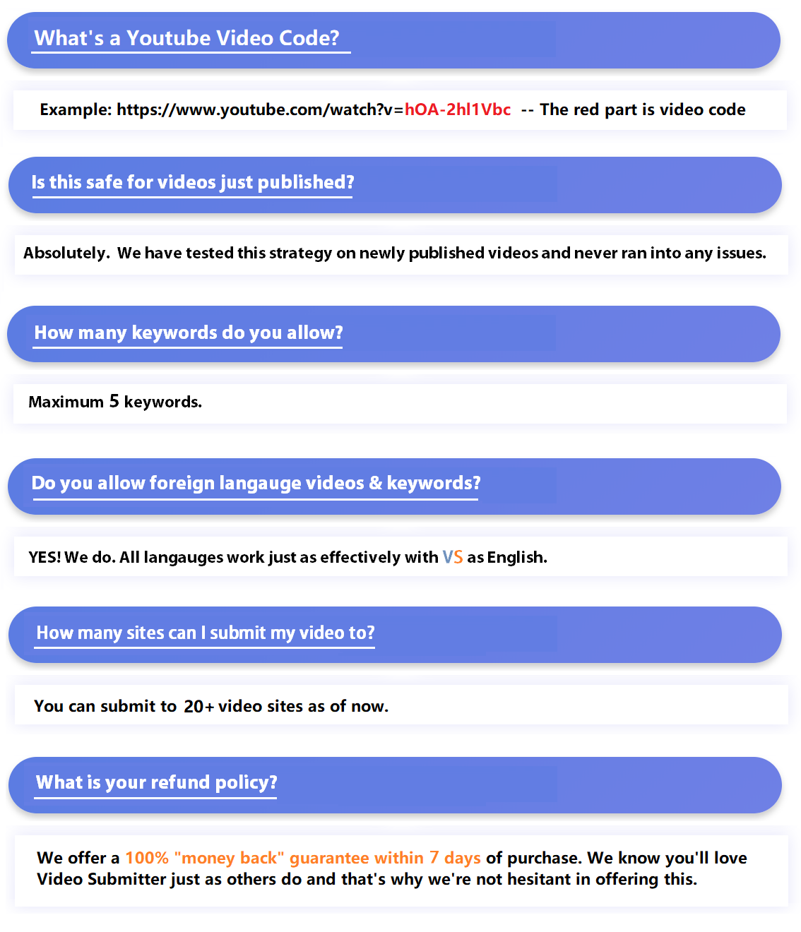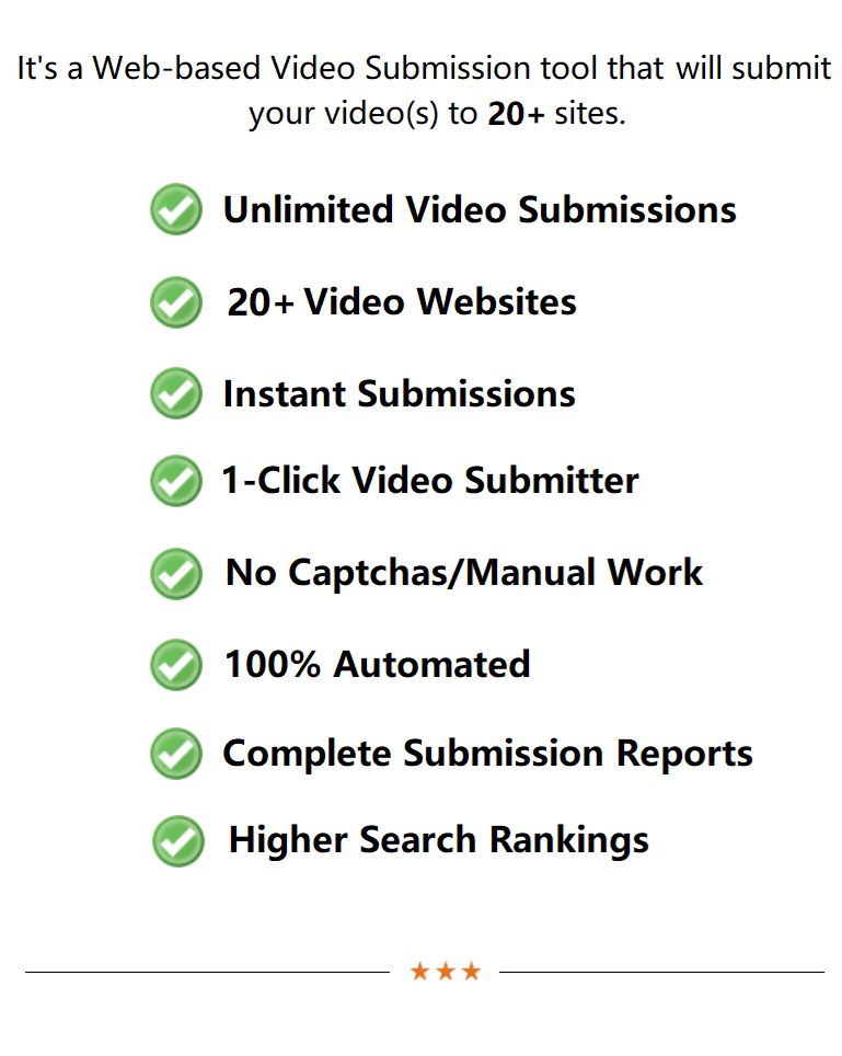 Forget about semi-automated tools, manual work, and expensive freelancers. VideoSubmitter is 100% automated and lightening fast! No captchas, No proxies, No manual work!